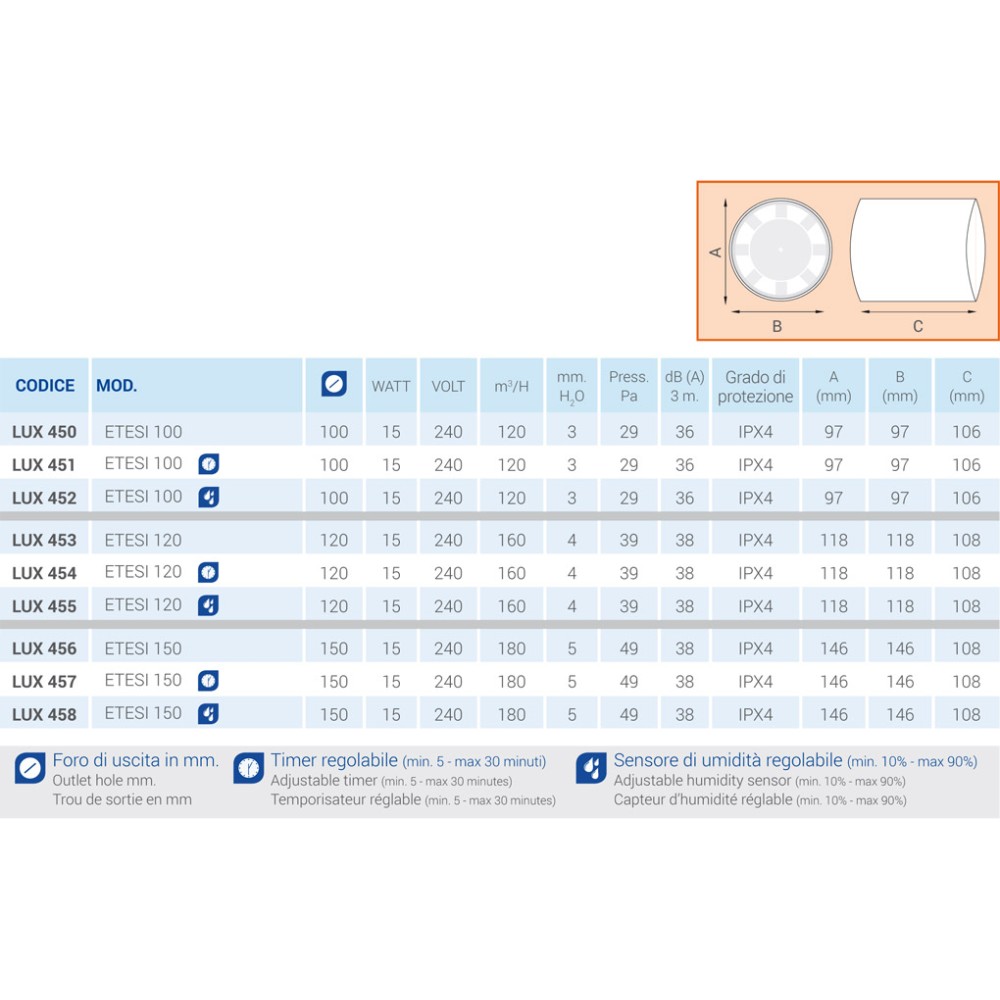 Scopri tutti gli aspiratori canalizzabili ETESI disponibili nel catalogo Tepla nei diametri 90mm, 100mm, 120mm e 150mm. Ogni diametro è disponibile in tre versioni: base (funzionamento continuo), TIMER (spegnimento automatico regolabile 5-30 minuti) e UMIDOSTATO (sensore di umidità regolabile 10-90%). I sistemi canalizzabili professionali garantiscono ventilazione invisibile ed efficace. Made in Italy LUX oltre 90 anni esperienza, garanzia ufficiale 2 anni.