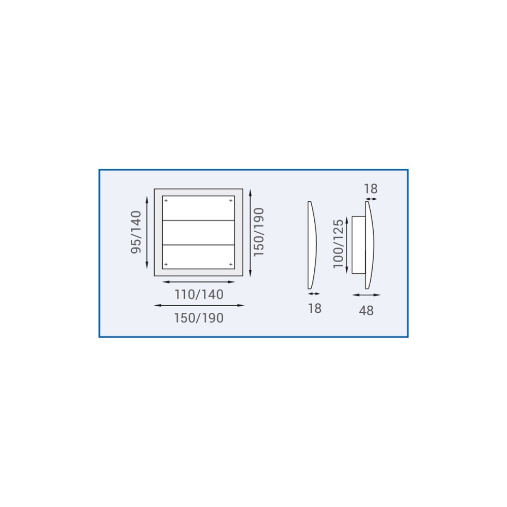Le dimensioni esterne di 150×150mm sono lo standard per le griglie di aspiratori con foro da 100mm. Copre perfettamente i fori esistenti nascondendo eventuali imperfezioni del muro attorno al tubo. Le dimensioni interne di 110×95mm si adattano ai tubi di scarico da 100mm più diffusi. Il profilo di 48mm di profondità permette l'installazione su muri standard senza problemi. La cornice da 18mm di spessore garantisce robustezza e tenuta perfetta al muro.