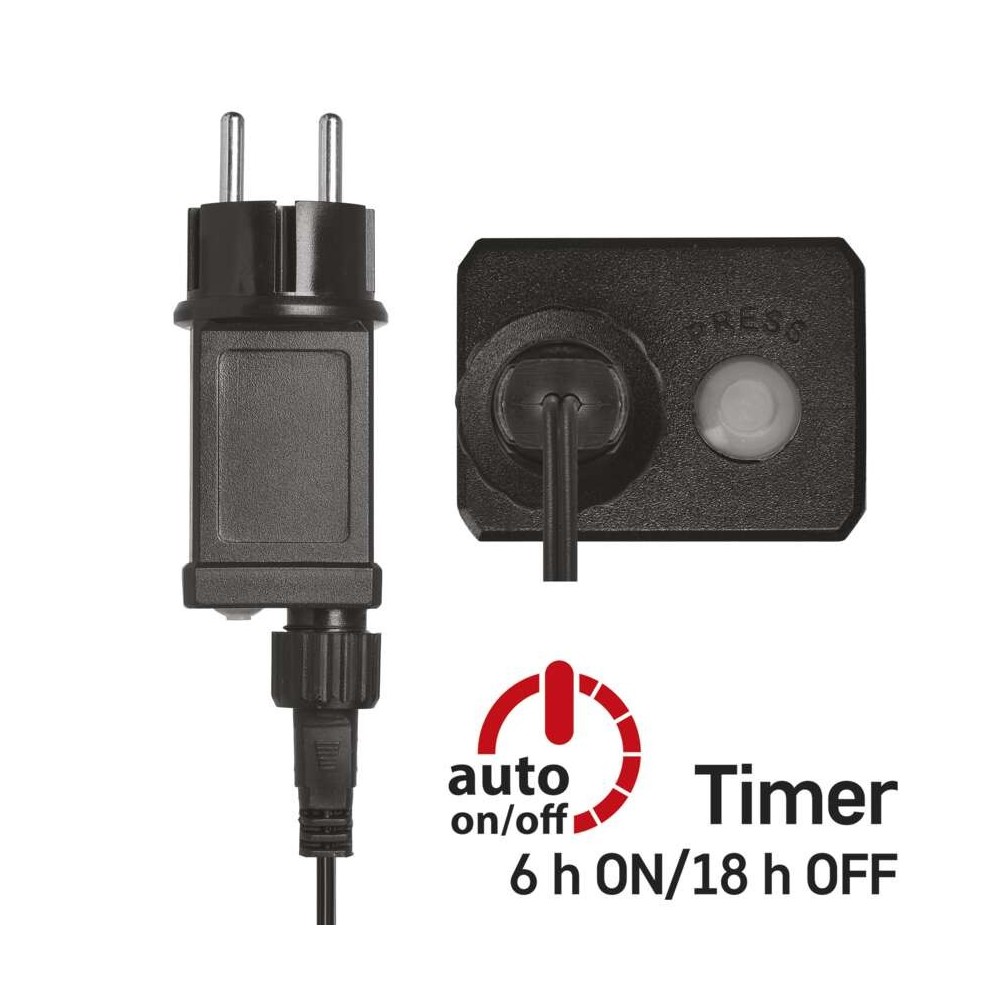 Il timer 6h ON / 18h OFF è essenziale per installazioni permanenti professionali. Lo programmi una volta all'orario del tramonto e da quel momento i 150 LED colorati si gestiscono automaticamente per settimane. Ogni sera si accendono, ogni notte si spengono. Zero interventi manuali per tutto il periodo natalizio.