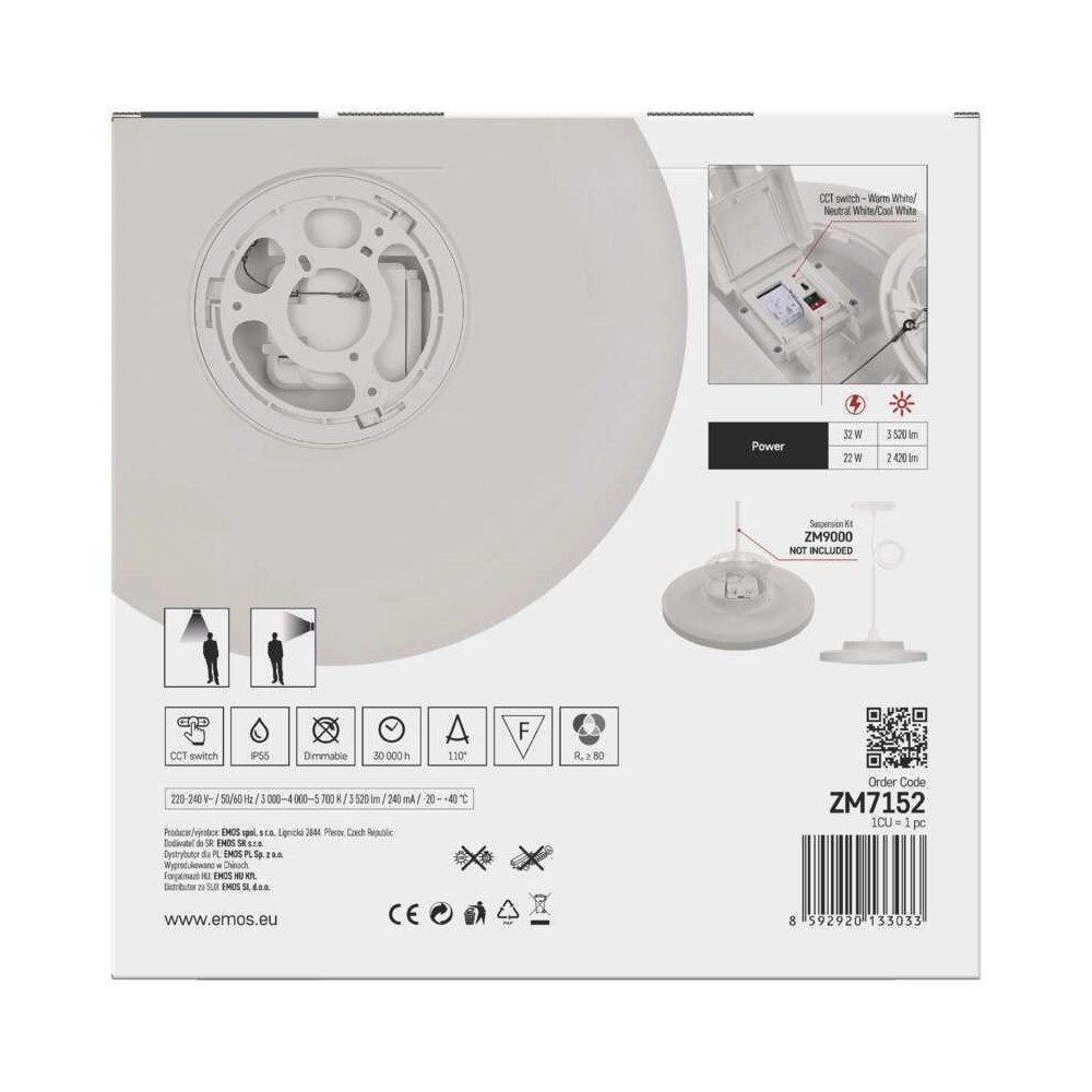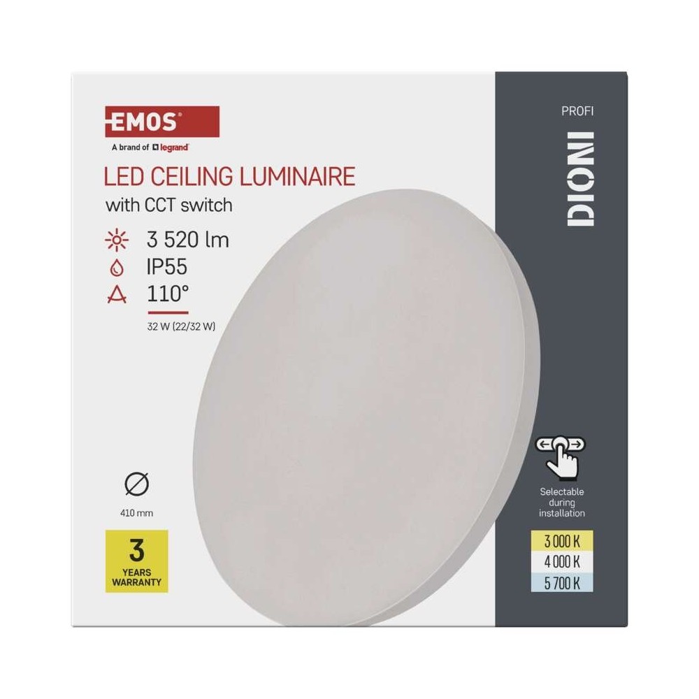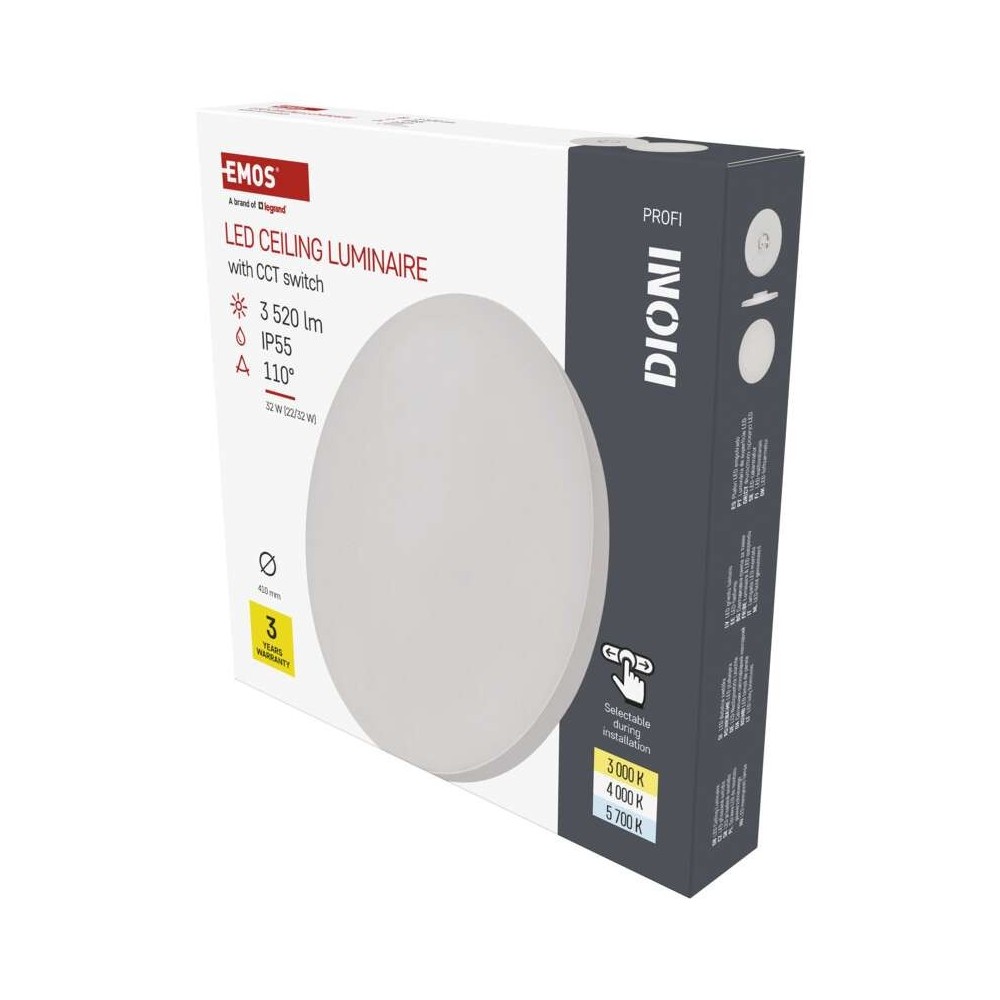 La plafoniera LED DIONI bianca EMOS ZM7152 unisce potenza luminosa e design moderno in un corpo sottile dal profilo elegante. Con doppia potenza selezionabile da 22W (2420 lm) o 32W (3520 lm), equivalente a un lampadario da 200W, garantisce un’illuminazione uniforme e intensa per stanze di circa 18 m². La tecnologia CCT consente di regolare la tonalità della luce: 3000K calda e accogliente, 4000K neutra e bilanciata, o 5700K fredda e brillante. Può essere installata a soffitto o parete e, con il kit di sospensione EMOS ZM9000, trasformata in un lampadario moderno e raffinato. La protezione IP55 la rende resistente all’umidità, perfetta per ogni ambiente della casa.